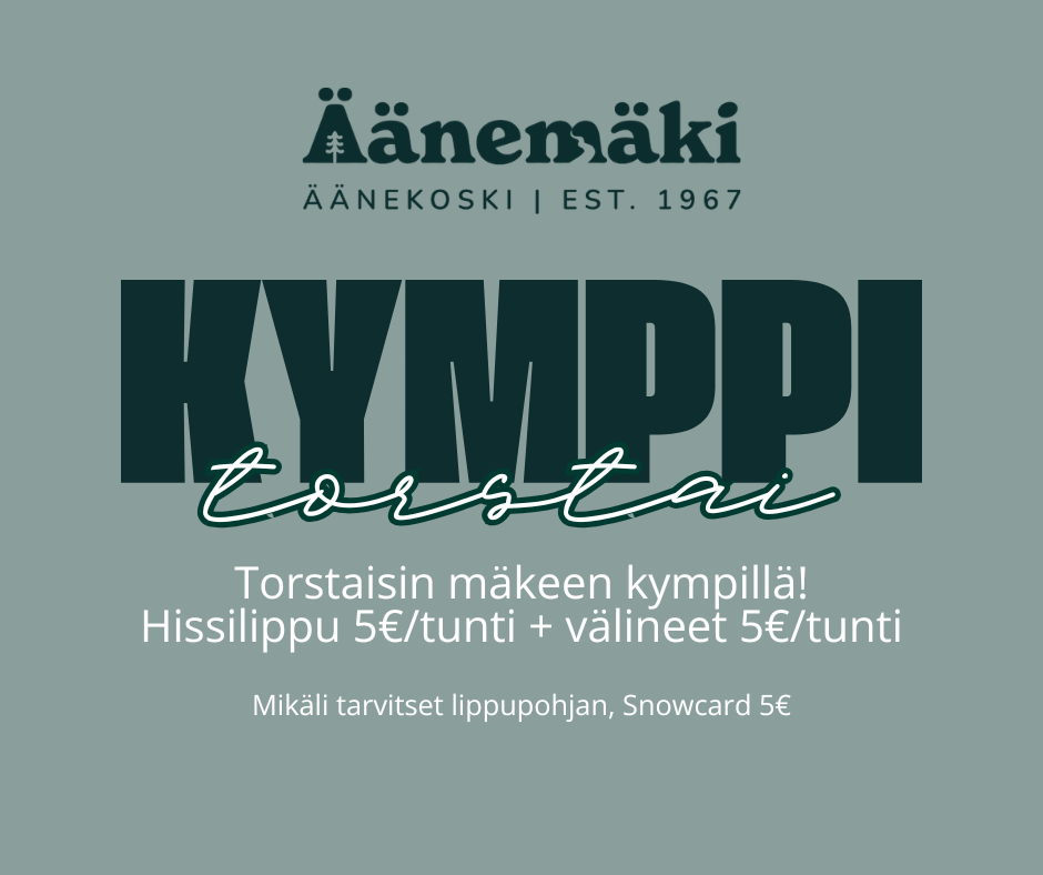 Laskettelukausi päättyy - vielä ehdit mukaan! Äänemäessä talven viimeinen laskupäivä on sunnuntaina 6.4. Loppuviikon tarjous, voimassa pe 4.4 - su 6.4.2025 Hissiliput 5€/h Välinevuokra 5€/h Nähdään…