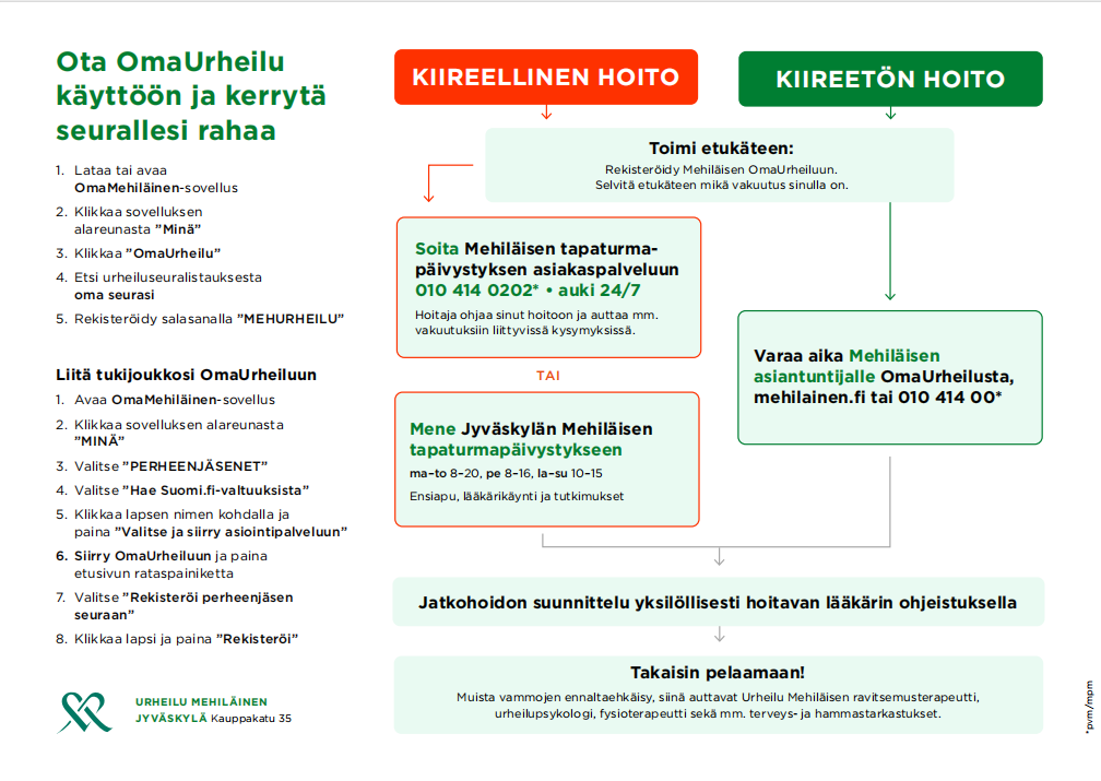Löydät Oma Urheilusta seuralle nimetyn hoitotiimin ja pääset sieltä varaamaan hoitotiimille vastaanottoajan. Tärkeät yhteystiedot löytyvät nopeasti sieltä sairaus- tai loukkaantumistilanteessa.