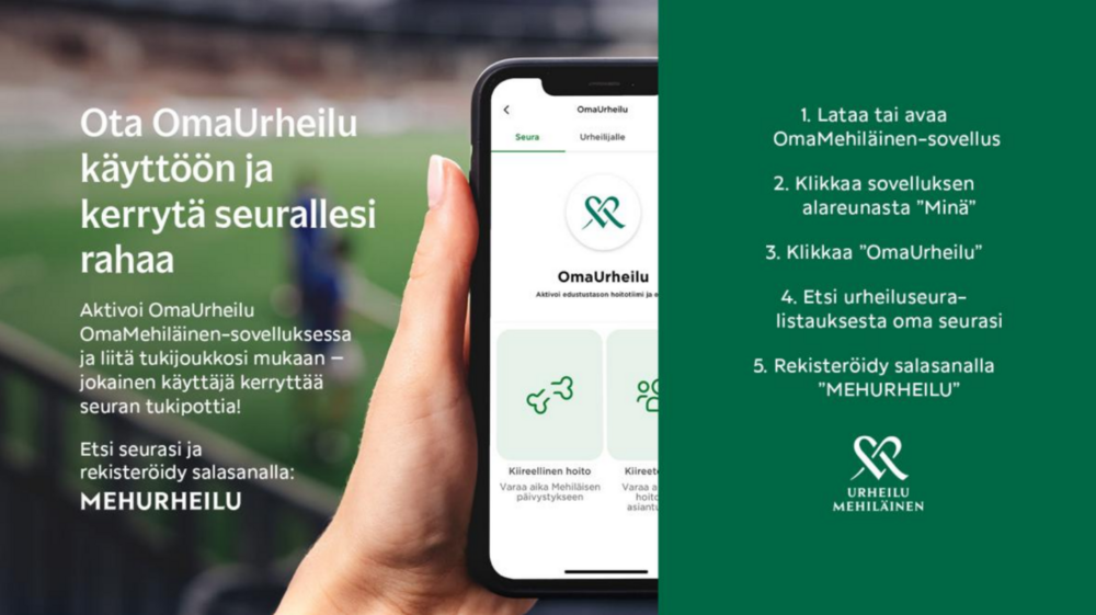 Lataa OmaMehiläisen-sovellus älypuhelimeesi tai kirjaudu verkkopalveluun, niin pääset rekisteröitymään OmaUrheiluun. Rekisteröitymällä OmaUrheilu -palveluun ja asioimalla Mehiläisessä kerrytät seuralle maksettavaa tukipottia. Myös seuran kannattajiksi rekisteröityneiden perheenjäsenten ja muun lähipiirin asiointi Mehiläisessä kasvattaa seuran tukipottia.